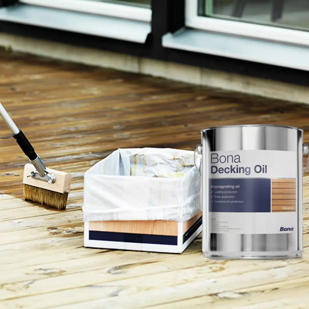 Jakmile je dřevo dokonale suché, je čas na ochranu povrchu. Použití kvalitního oleje na venkovní terasy, jako je Bona Decking Oil, obnovuje přirozené oleje dřeva a poskytuje bariéru proti vlhkosti a UV záření.
