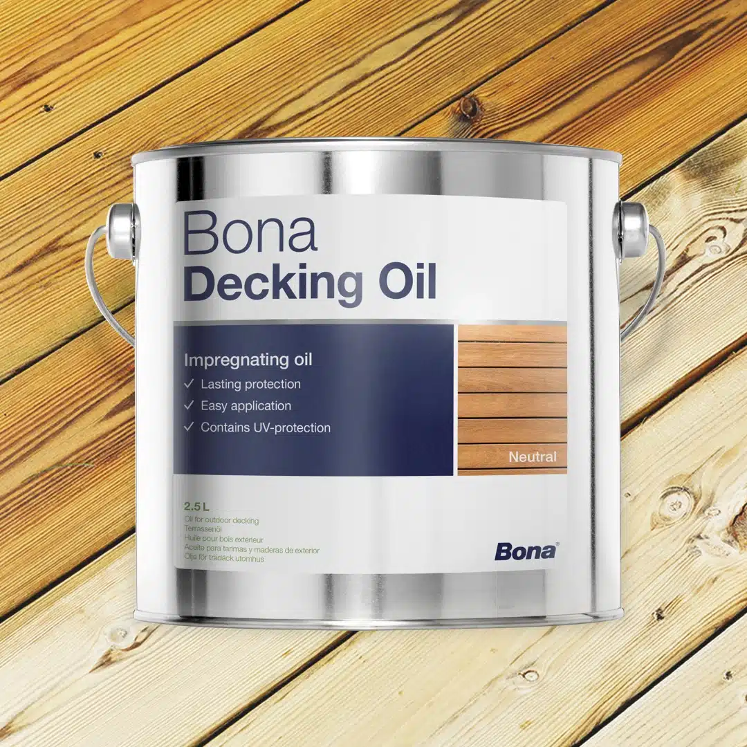 Bona Decking Oil je složen ze směsi přírodních rostlinných olejů pro ochranu venkovních dřevěných ploch, zábradlí, palubek (deckingů) a nábytku v exteriéru. Tento olej poskytuje kombinaci hloubkové impregnace dřeva pro zachování jeho pružnosti, prevence proti deformaci prken a tvorbě prasklin s optimální ochranou povrchu, která získá vodoodpudivé vlastnosti a odolnost vůči usazováním nečistot. Olej také obsahuje složky, které redukují UV-záření na dřevo.