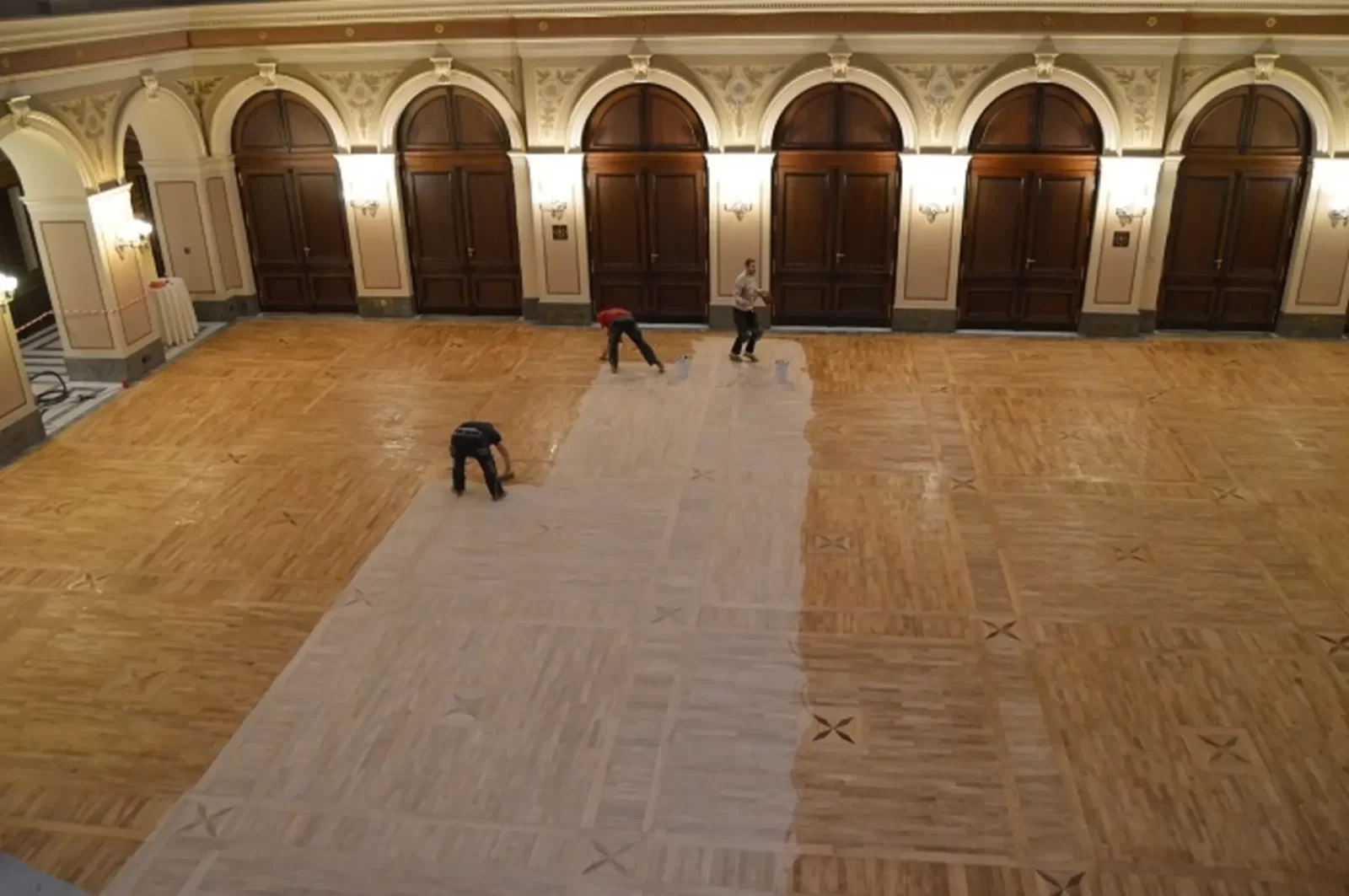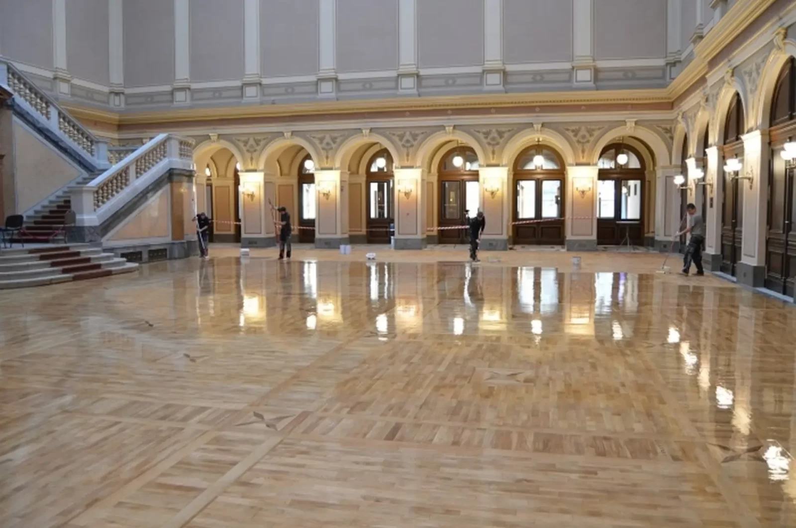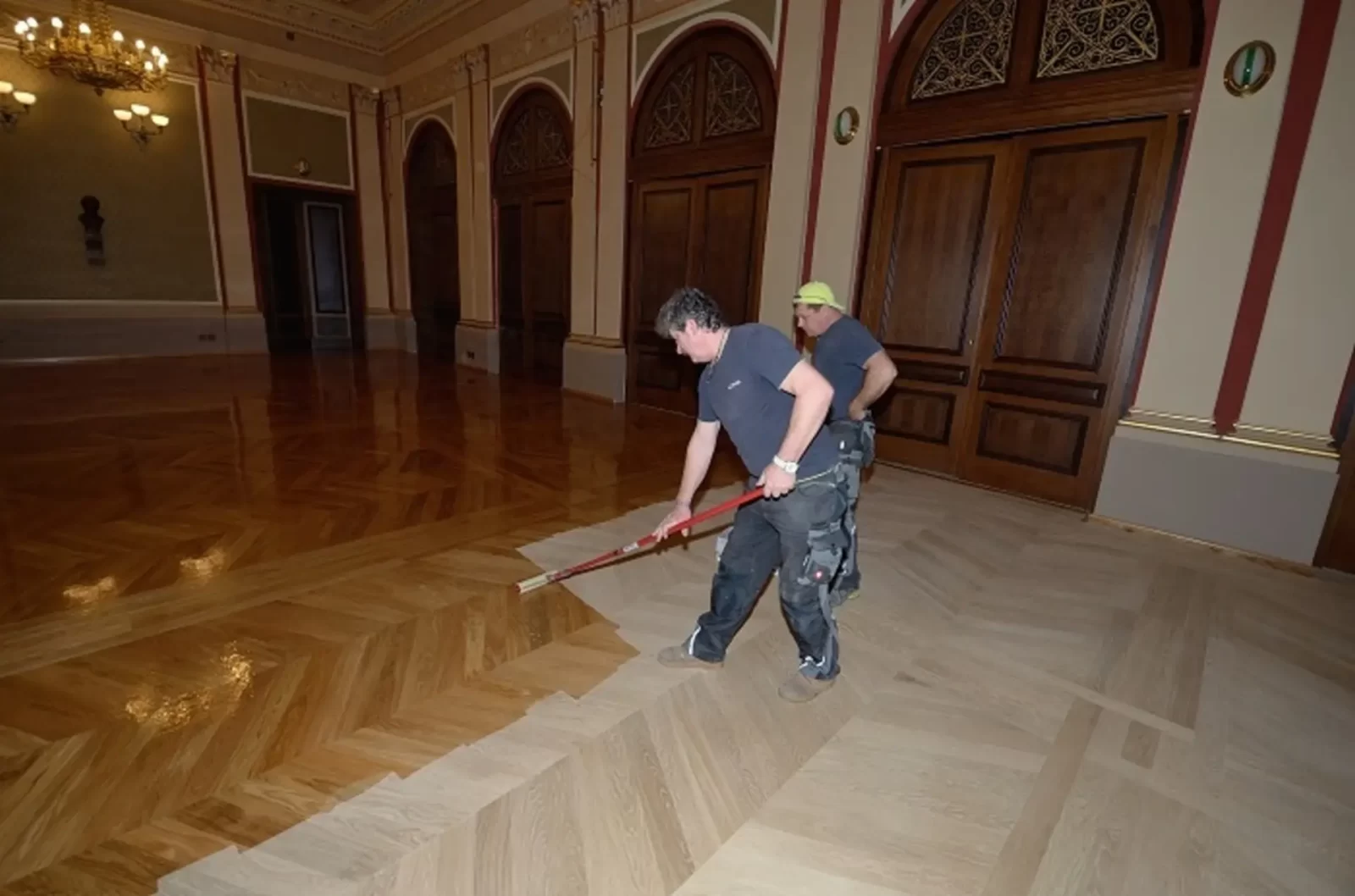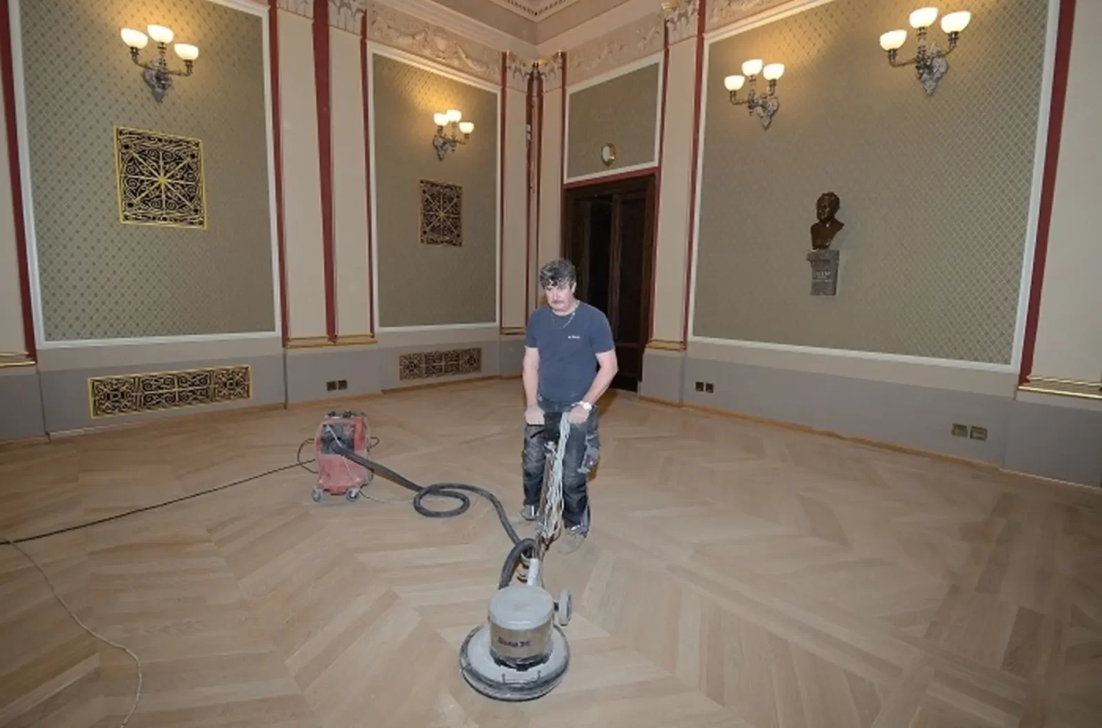 V Sukově síni firma Altryss nalepila 300 m2 nových masivních dubových podlah lepidlem Bona R850 na nový podklad z rychleschnoucího betonu. Masivní dubové prvky se lepili na maďarský vzor a celá plocha je rozdělena bordurami. Ve Sloupové síni, kterou realizovala firma Procházka Parket, bylo nutné demontovat staré parkety a původní prkenný záklop. Po vyrovnání podkladních trámů a dorovnání zásypu, byla opracovaná prkna namontována zpět. Následná pokládka cca 230 m2 byla provedena přibíjením do maďarského vzoru a opět s velkým množstvím bordur. V největším prostoru, Dvoraně, o celkové rozloze 500 m2 bylo nutné udělat cca 30 m2 lokálních výměn tabulových kazet. Následně byla provedena celková renovace podlahy.