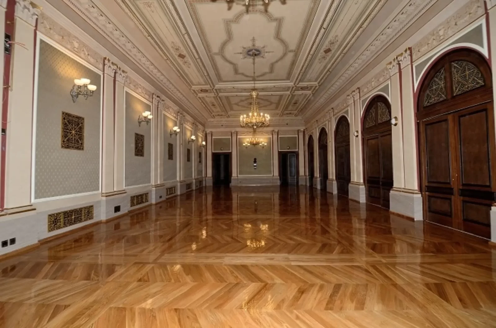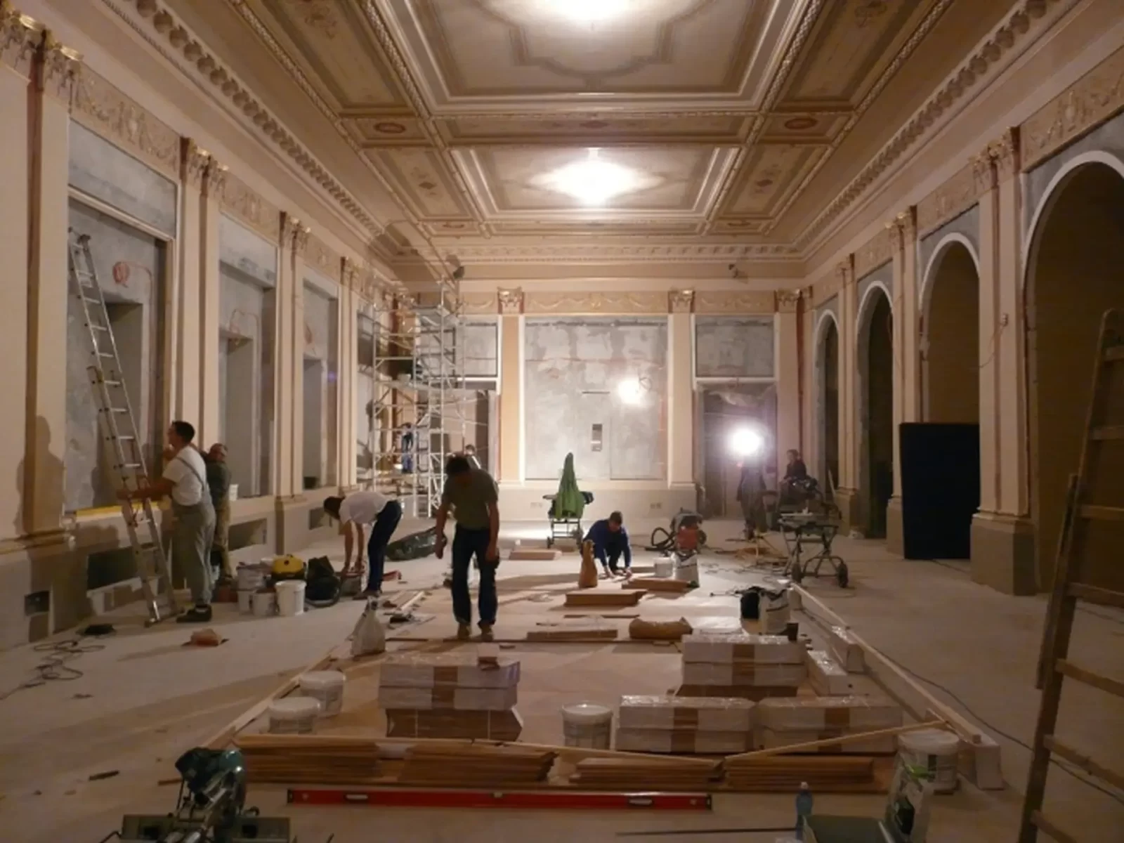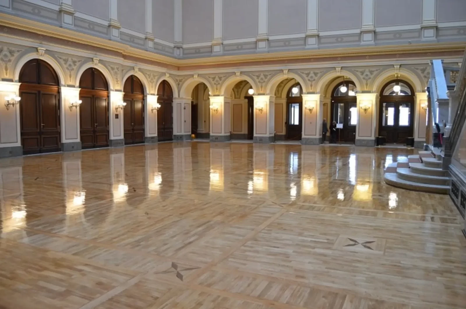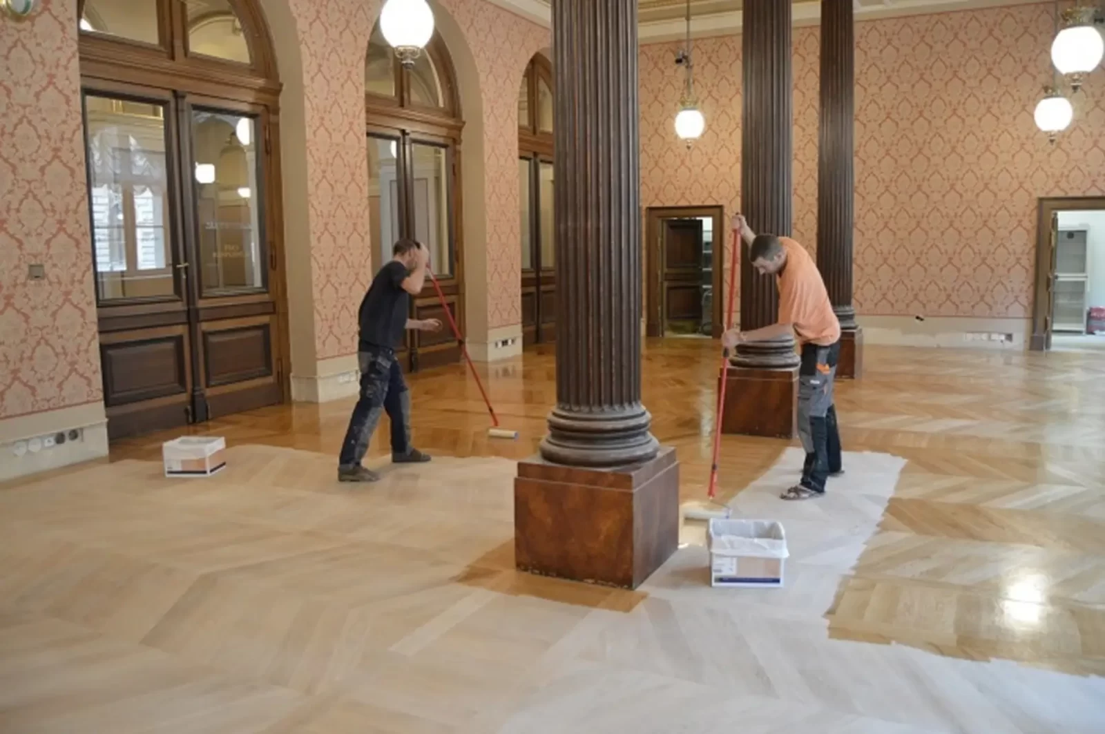 V Sukově síni firma Altryss nalepila 300 m2 nových masivních dubových podlah lepidlem Bona R850 na nový podklad z rychleschnoucího betonu. Masivní dubové prvky se lepili na maďarský vzor a celá plocha je rozdělena bordurami. Ve Sloupové síni, kterou realizovala firma Procházka Parket, bylo nutné demontovat staré parkety a původní prkenný záklop. Po vyrovnání podkladních trámů a dorovnání zásypu, byla opracovaná prkna namontována zpět. Následná pokládka cca 230 m2 byla provedena přibíjením do maďarského vzoru a opět s velkým množstvím bordur. V největším prostoru, Dvoraně, o celkové rozloze 500 m2 bylo nutné udělat cca 30 m2 lokálních výměn tabulových kazet. Následně byla provedena celková renovace podlahy.