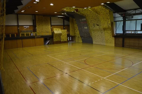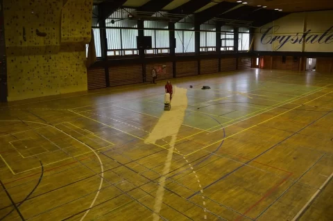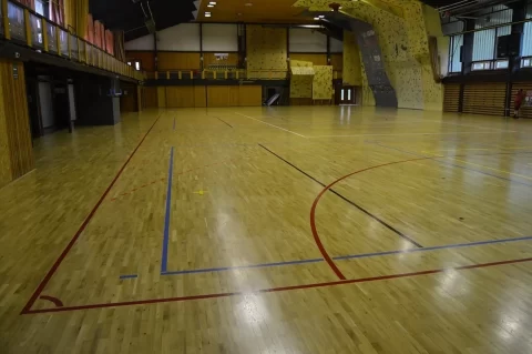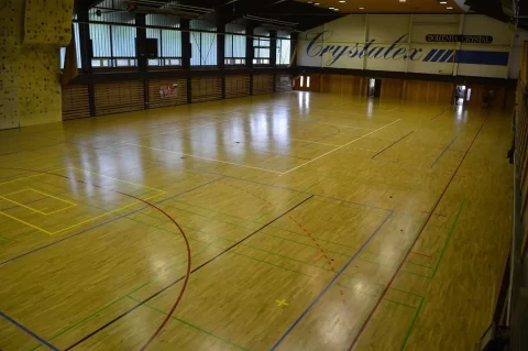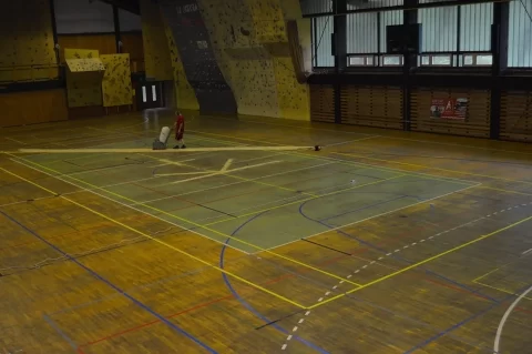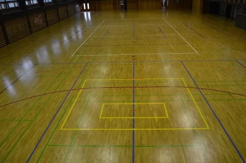 Na konečné dobroušení zrnitost P60 a finální broušení proběhlo strojem Trio brusivem P60 a P80. Na povrchovou úpravu byl použit základní lak Bona Classic a vrchní lak Bona Wave ve dvou vrstvách. Vyznačení hřišt provedla odborná firma pana Vlka.